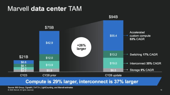 在高需求驱动下,Marvell董事局主席兼CEO Matt Murphy由此预测数据中心定制芯片市场的市场规模到2028年将达到940亿美元,复合年增长率35%,相较于去年预测750亿美元已扩容达26%。而这940亿美元的市场中,定制加速计算市场体量最大,达554亿美元,增速最快;互连(Interconnect)为第二大市场,规模190亿美元;交换和存储则保持持续稳定增长。