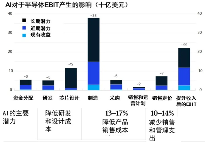 对算力的无止境追求,也进一步推动对半导体先进节点的需求,为了追求更高的算力和更优的功耗,AI半导体开始引入新结构、新工艺和新材料,对于半导体制造产业链的带动作用明显,特别是加速前端半导体制造供应链的扩张。麦肯锡预计,AI对于半导体制造产生的贡献最大,约为380亿美元。同时受益于芯片设计和验证自动化,芯片研发和设计成本未来也将相应降低。