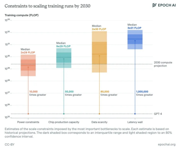 Epoch AI指出,全球AI训练规模受电力供给、芯片制造能力、数据稀缺性和延迟墙4大主要因素制约,其中电力供给有可能成为制约训练规模的最大短板。