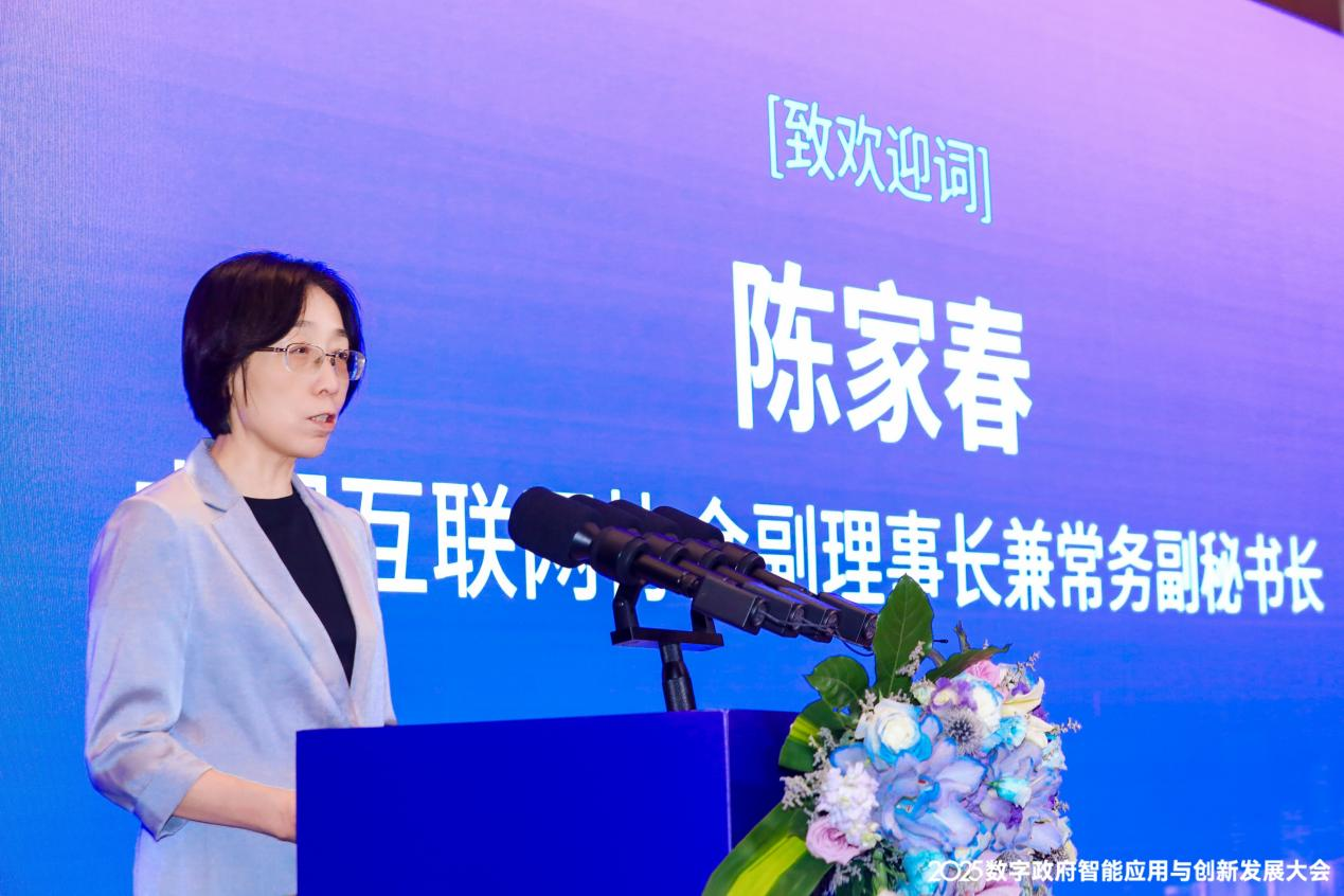 陈家春代表协会向全体与会嘉宾表示诚挚欢迎与感谢。她在致辞中指出,建设数字政府是时代赋予的必答题,关乎治理现代化和人民群众的幸福感。她强调,中国互联网协会将持续发挥桥梁和纽带作用,搭建高水平交流平台,强化智库支撑和标准引领,全力助推政务数字化转型升级。本次大会旨在聚焦政府数智化转型、推动跨行业数智融合、汇聚优秀实践成果,凝聚共识为数字政府建设注入新动能,为中国式现代化提供数字驱动力。