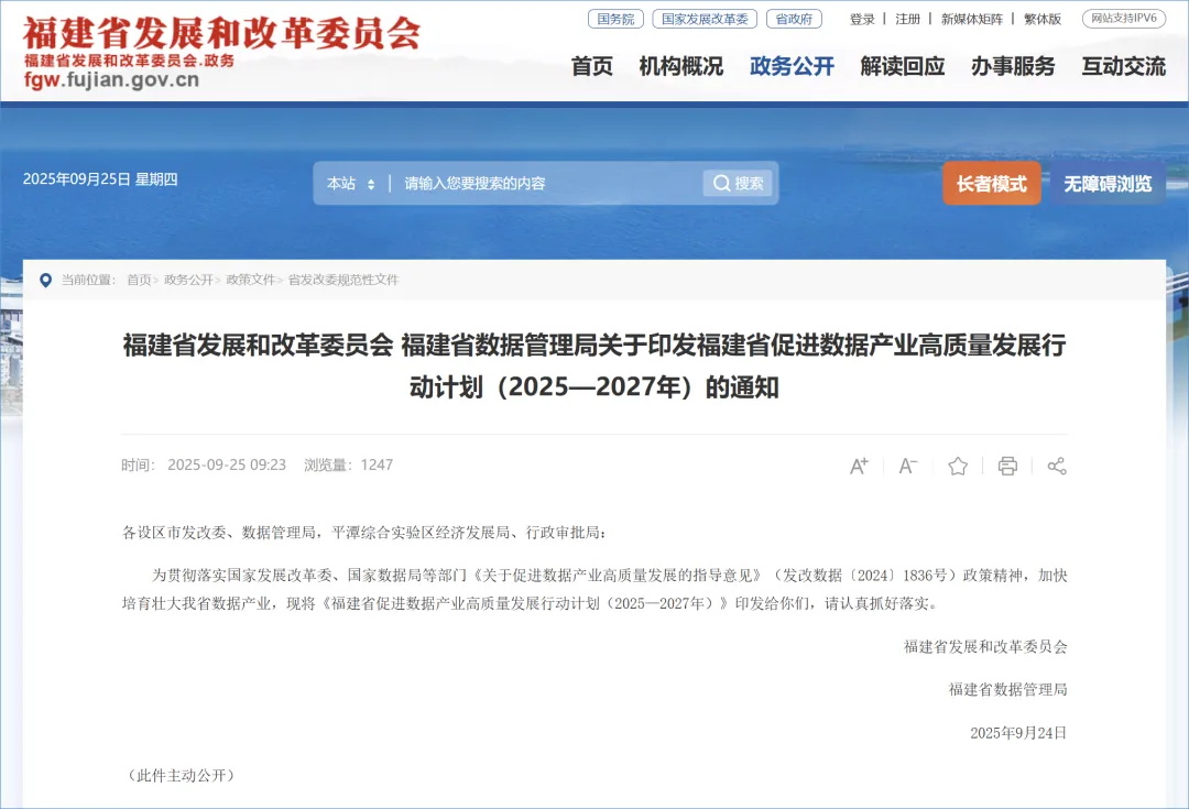 9月25日,福建省发展和改革委员会、福建省数据管理局印发《福建省促进数据产业高质量发展行动计划(2025—2027年)》(以下简称“行动计划”)。