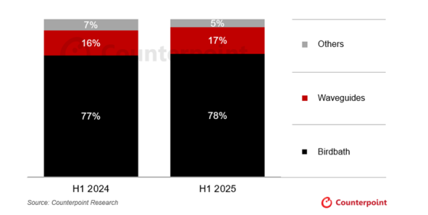 而基于波导技术、以信息显示为核心的AR智能眼镜,虽然当前市场份额仅为17%(2024年上半年为16%),但凭借更轻薄的产品形态、更优质的显示效果,逐渐成为高端市场的核心发展方向。数据显示,2025年上半年波导技术AR智能眼镜的平均售价(ASP)比Birdbath产品高出约27%,其技术附加值与高端定位不言而喻。