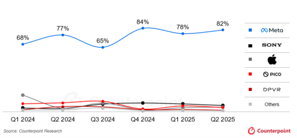 这种停滞感在竞争格局上体现得尤为明显。Meta作为行业龙头,凭借成熟的产品生态与庞大的用户基础,牢牢占据着市场主导地位。从2024年Q1到2025年Q2的季度数据来看,Meta的市场份额始终稳定在77%至84%的高位区间,2025年上半年整体份额更是接近80%,几乎垄断了主流消费级VR市场。相比之下,SONY、PICO、DPVR等其他品牌的市场空间被严重挤压,难以对Meta的地位形成有效挑战,整个VR市场的竞争活力显得格外不足。