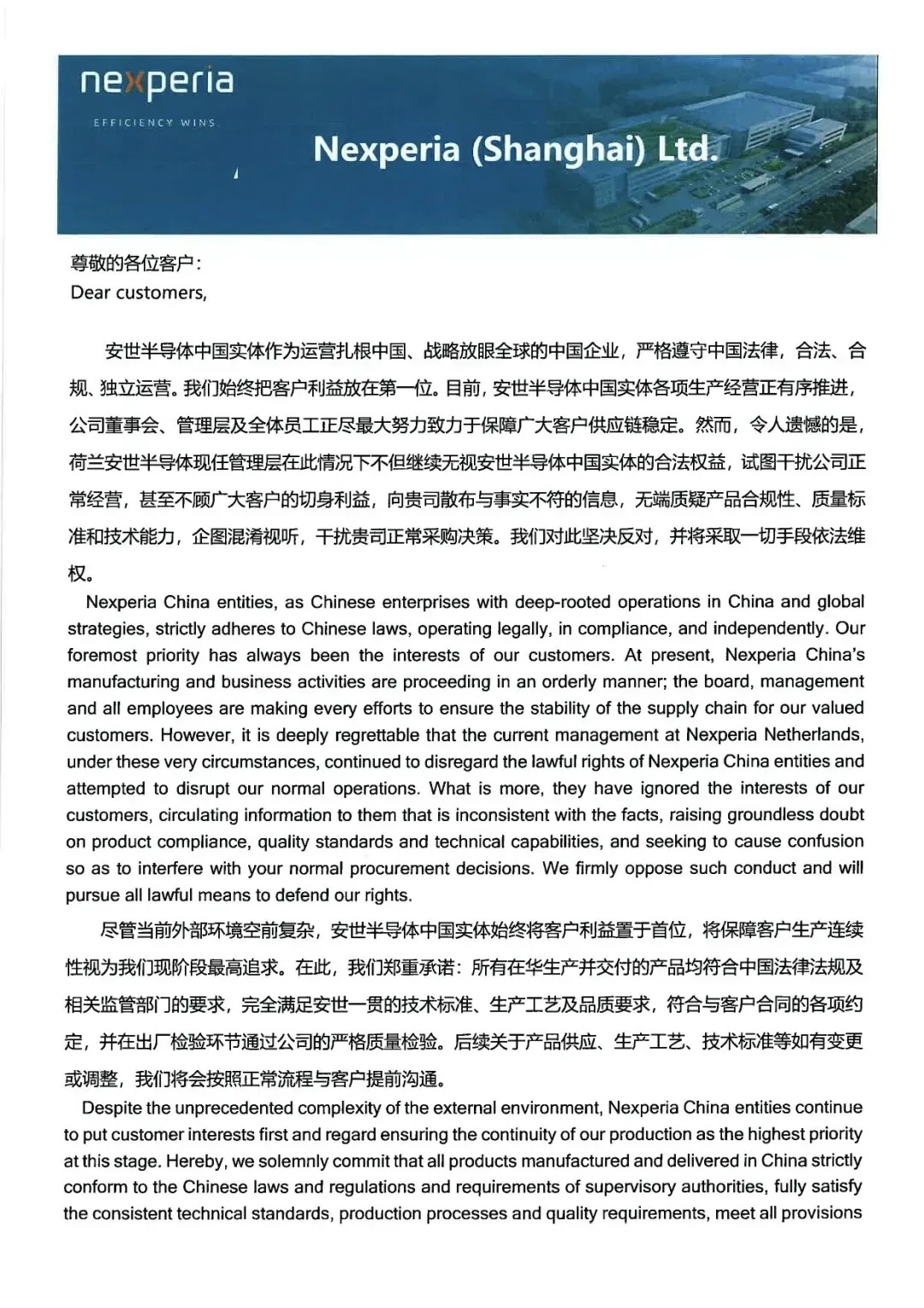 作为回应,10月23日下午,安世半导体(上海)有限公司向客户发布了一封公开信,针对荷兰安世半导体现管理层的行为进行了回应,并重申了其对中国客户的承诺。