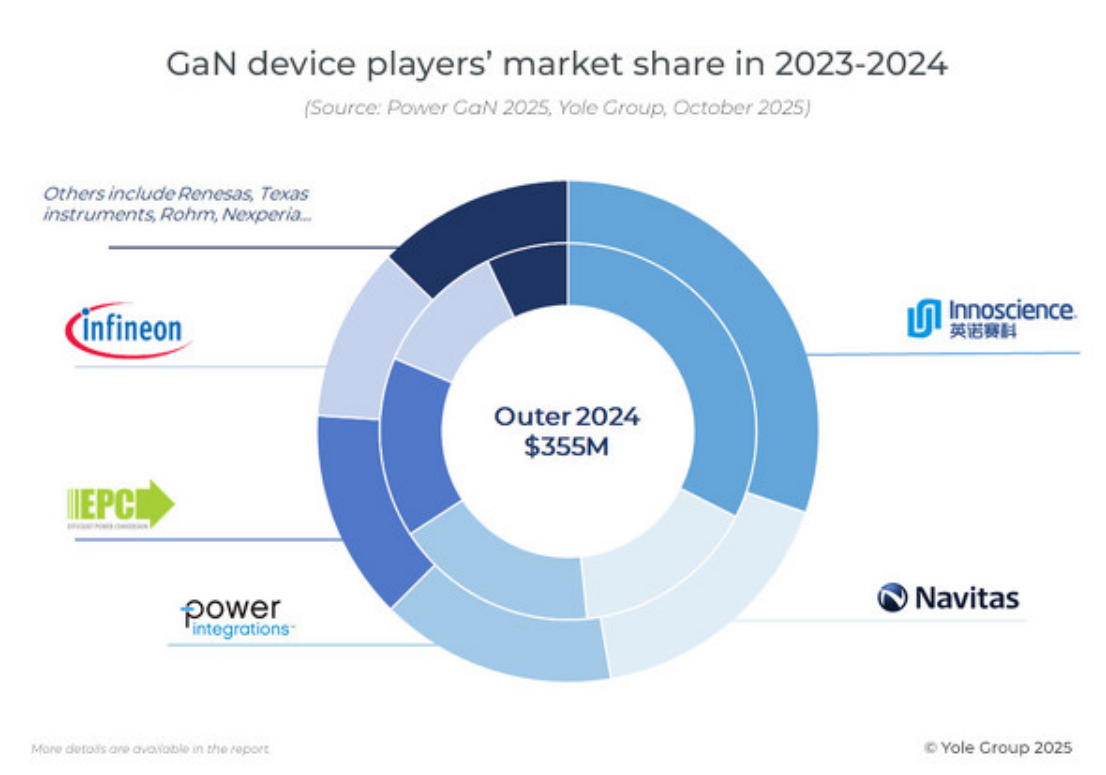 Yole还提到,意法半导体正在建设一条8英寸GaN晶圆厂,Nexperia正在扩展其e-mode平台,ROHM也发布了EcoGaN器件。Yole评论道:“三星电子正准备在2026年推出GaN产品。安森美半导体一直保持沉默,但其2024年发布的GaN技术论文以及在硅/碳化硅领域的强大地位,使其进军GaN市场似乎不可避免。”
