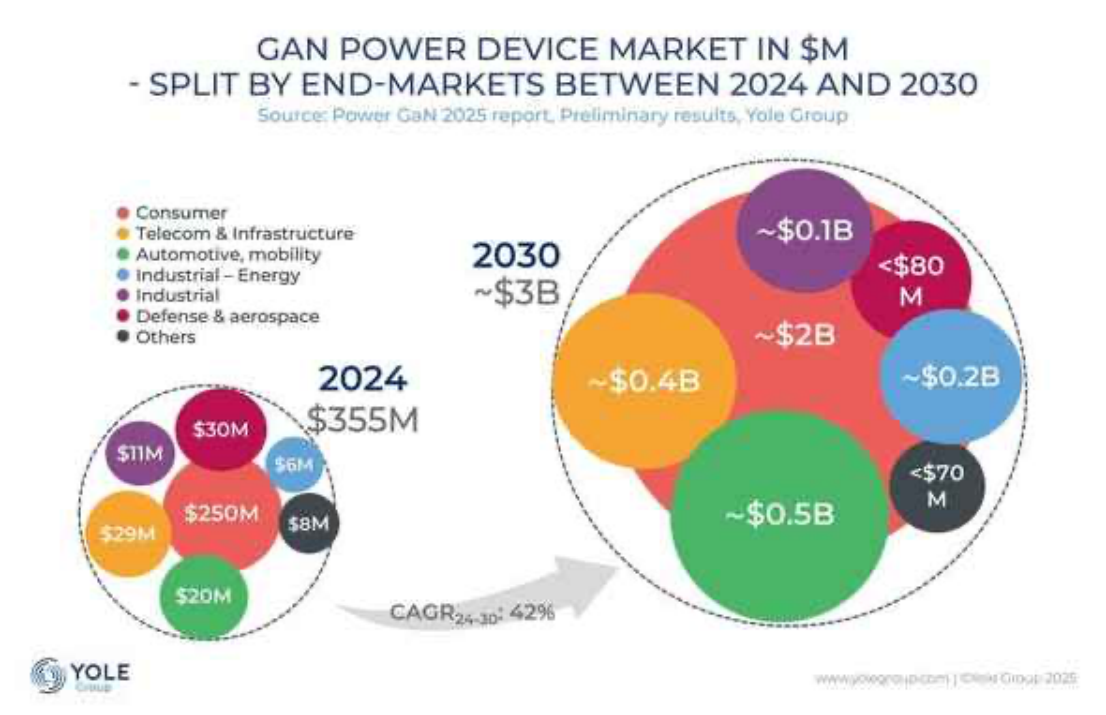 据法国市场研究公司Yole Group预测,氮化镓(GaN)功率器件市场预计将在2024年至2030年间以42%的复合年增长率(CAGR)增长,达到约30亿美元。