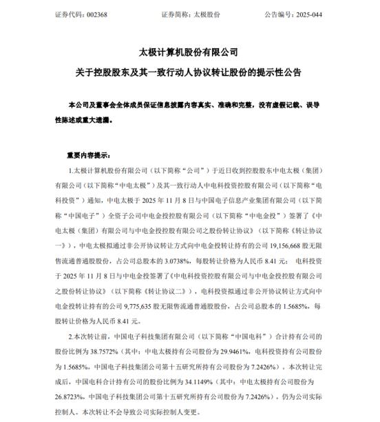 与此同时,中国电科旗下太极股份发布公告称,控股股东中电太极及其一致行动人电科投资拟分别向中国电子全资子公司中电金投转让1915.67万股(占总股本3.0738%)和977.56万股(占总股本1.5685%),交易单价8.41元/股,低于11月7日太极股份25.06元的收盘价。若顺利落地,中国电科对太极股份持股比例将维持34.1149%,仍为实控人;中国电子则通过中电金投间接控制4.6423%股权。