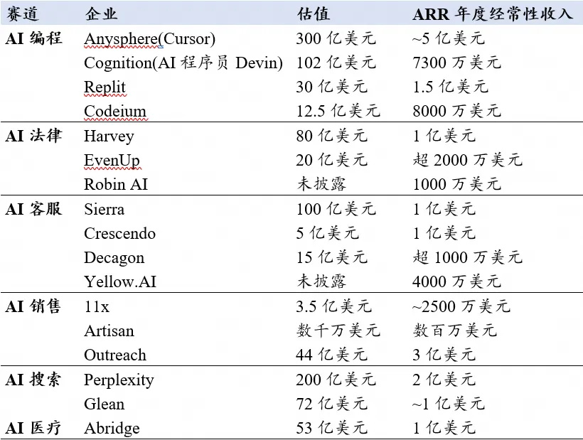 回顾2024年,北美涌现了一大批AI应用独角兽,分布在编程、法律、客服、销售、搜索等多个赛道。总结来看,这些赛道共通的特性是借助大模型能处理海量信息并生成的能力,实现从问题到答案的最短路径。