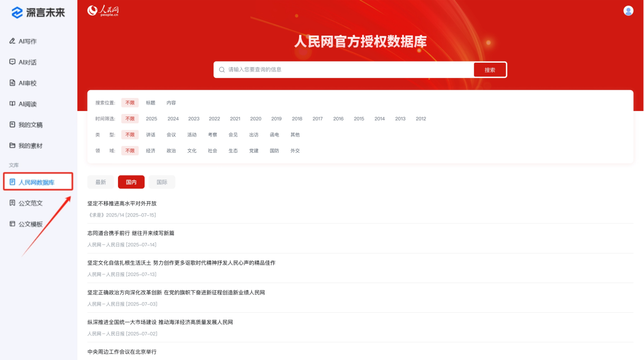 依托人民网长期在党政领域积累的权威政策语料库与结构化的知识资源,深言未来智能政务办公一体机深度融合人民网数据库中的权威法律法规、政策文件等高质量数据内容。通过对这些资料进行系统性的解析,不仅丰富了一体机本地知识图谱,更显著提升了系统对政策语境的理解与分析。在实际的写作应用中,能够基于权威数据源,确保输出内容权威规范,从根本上保障了公文内容的正确、规范性与专业性。