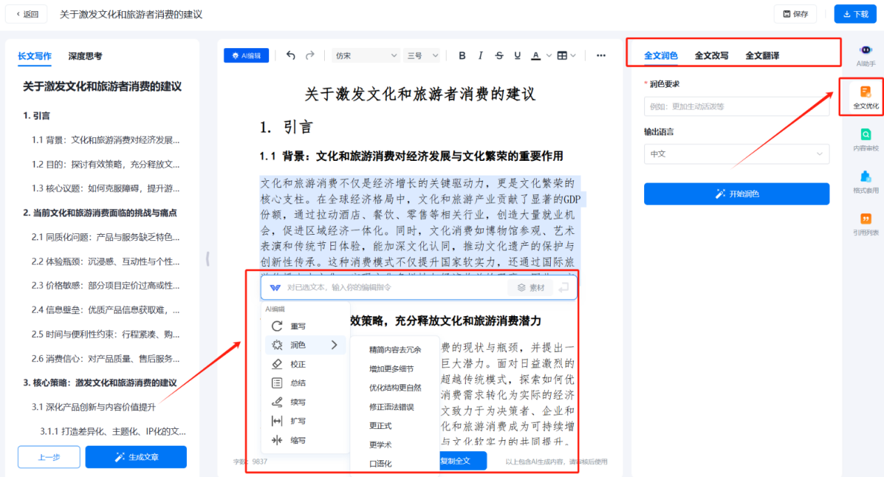 • 提供强大的修改功能,通过选中需要修改的内容并根据弹窗提示操作,轻松完成文章内容的优化调整,快速丰富文章内容,提升文章质量