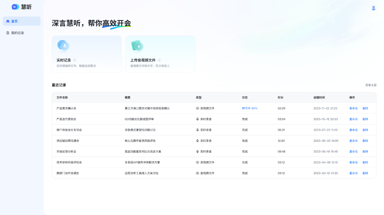 • 实时语音转写、智能生成会议纪要内容