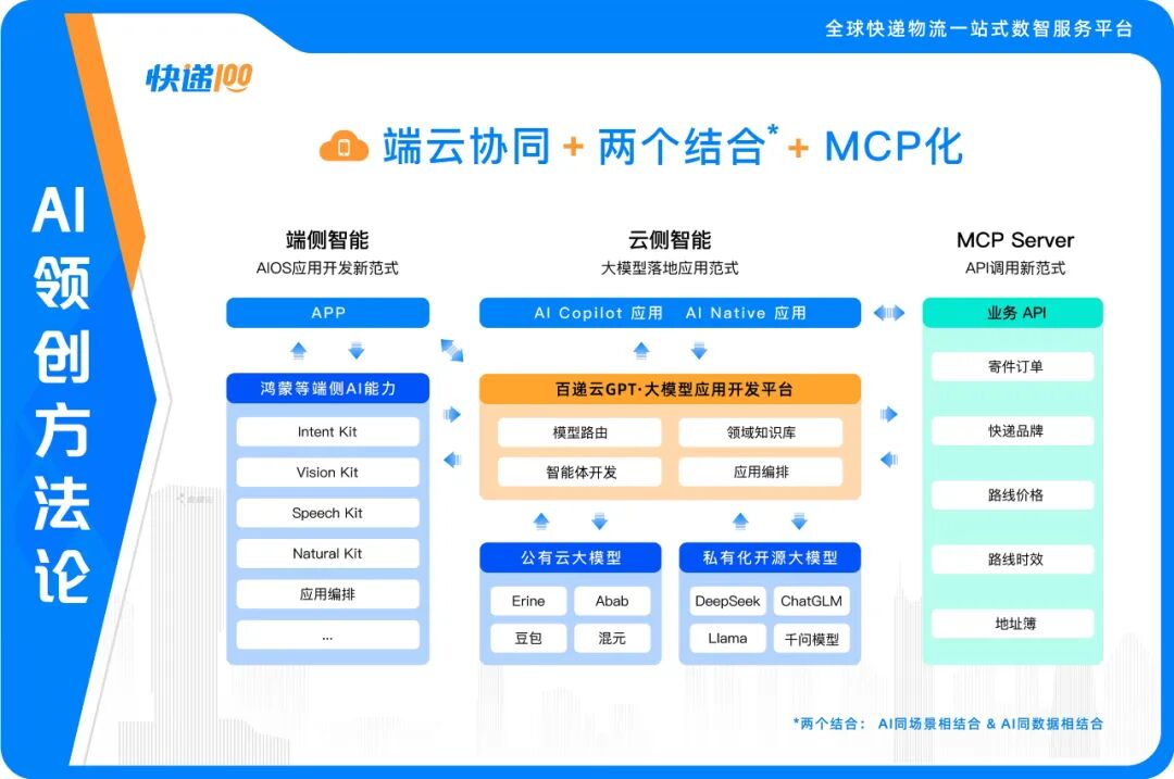 2023年以来,AI大模型席卷全球。快递100应时而动、厚积薄发,启动“AI领创”战略——“AI IN ALL&ALL IN AI”,用AI赋能全线产品进行持续性创新,用AI原生技术进行颠覆式产品创新。在AI应用的实践与探索过程中,快递100已逐渐形成“端云协同+两个结合+MCP化”的创新方法论。