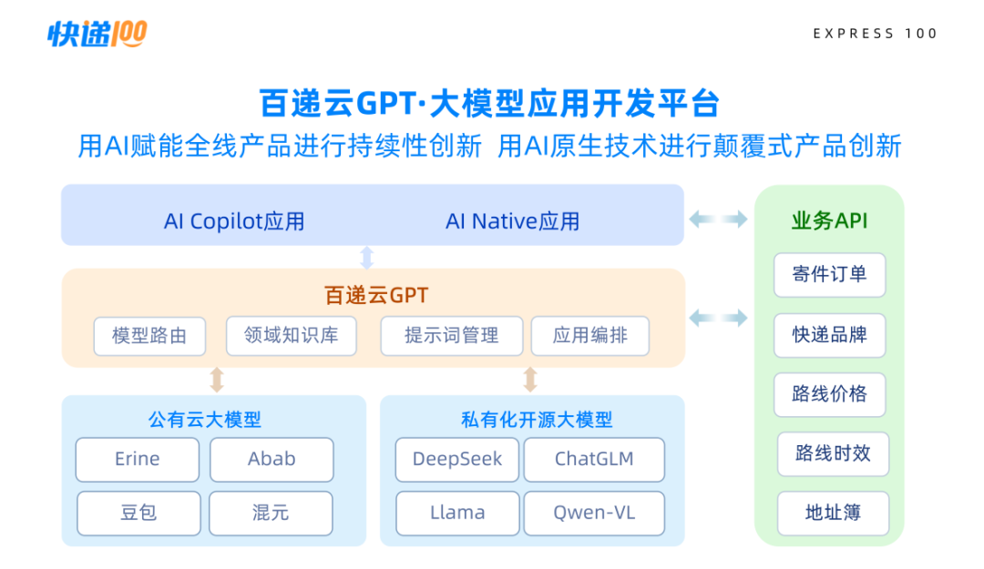 快递100积极融入云侧智能和端侧智能生态(端云协同)。在云侧智能方面,快递100作为云侧智能大模型首批合作伙伴,领创大模型落地应用新范式。快递物流场景与AI大模型是天作之合,大模型只有与应用场景相结合才有真价值。快递100率先成为百度文心大模型、腾讯混元元宝品牌智能体、稀宇科技MiniMax等大模型龙头首批合作伙伴,惊喜发布快递物流行业首个大模型AI原生商业化应用「AI寄快递」。自主研发的混合智能(Hybrid AI)架构大模型应用开发平台——「百递云GPT」。快递100将大模型能力和快递物流数据相结合、和查询/寄件/管理等业务场景相结合,融入真实商业交易场景与企业业务流程,做行业难事、解客户难题。