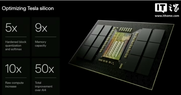 马斯克称AI5是“一项令人惊叹的设计”,相较当前的AI4芯片实现了“巨大的飞跃”:运算速度提升约40倍,原始算力提高8倍,内存容量增加9倍,同时每瓦能效也达到AI4的3倍。