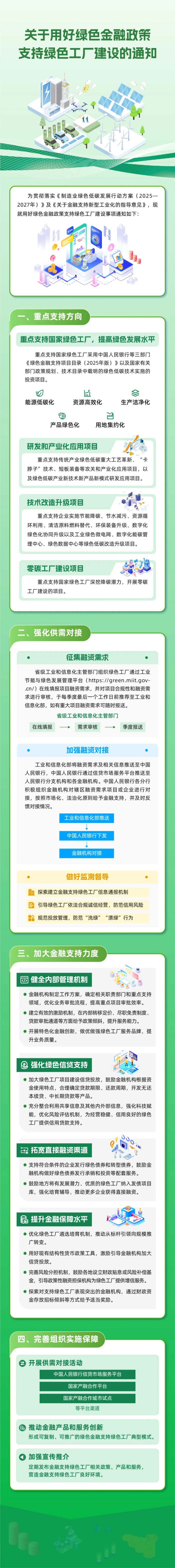为深入贯彻党中央关于加强金融服务实体经济有关决策部署,落实国务院办公厅《制造业绿色低碳发展行动方案(2025—2027年)》以及中国人民银行等七部门《关于金融支持新型工业化的指导意见》,进一步建立完善绿色金融支持绿色工厂工作机制,现就用好相关政策支持绿色工厂建设事项通知如下: