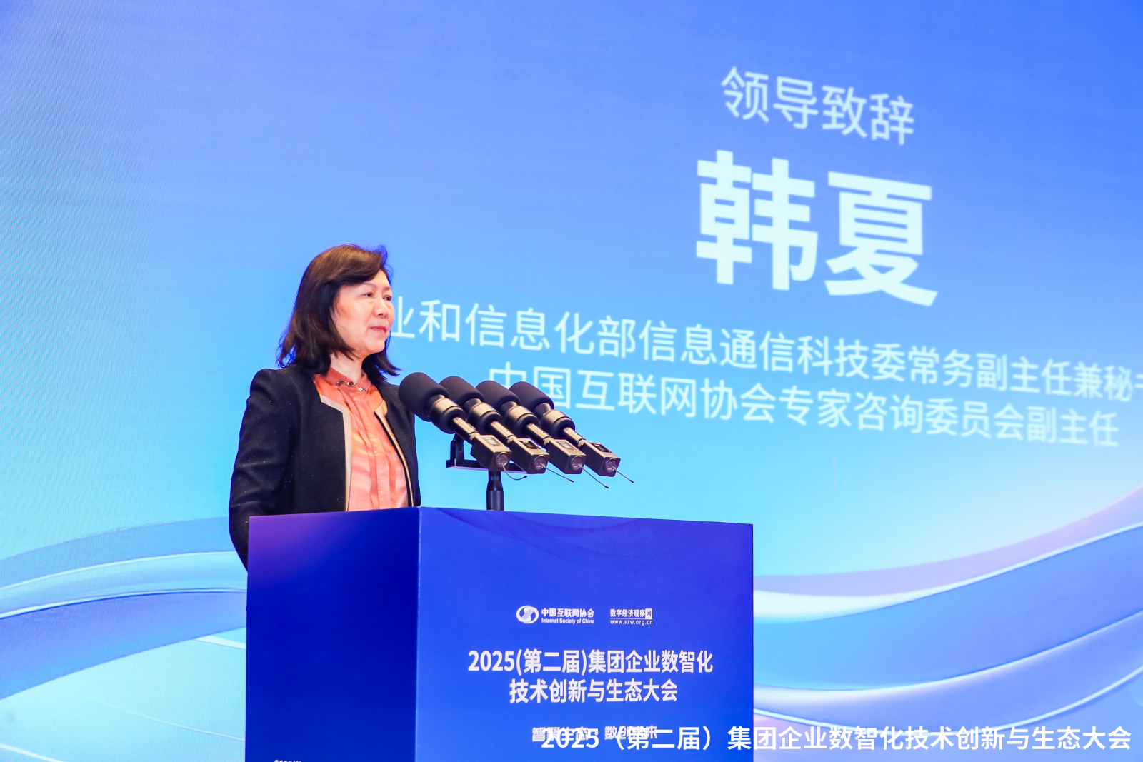 工业和信息化部信息通信科技委常务副主任兼秘书长、中国互联网协会专家咨询委员会副主任韩夏出席大会并致辞。她指出,在国家相关战略指引下,集团企业正从数字化转型迈向数智化跃升,已在核心技术攻坚、产业转型赋能、要素聚合驱动、生态协同凝聚等方面取得显著成效。同时,她提到,当前集团企业数智化转型正处于机遇与挑战并存的关键阶段,亟待各方凝聚共识、协同发力。对此,她提出四点建议:一是锚定自主可控,夯实技术根基;二是聚焦场景赋能,深化融合应用;三是推动融通发展,共建共赢生态;四是聚合产业智慧,筑牢安全基石。她强调,数智化转型是企业实现高质量发展的必由之路,工信部信息通信科技委也将持续发挥智库作用,加强前沿趋势研判,与各方携手共进,为制造强国、网络强国和数字中国建设贡献更多智慧与力量!