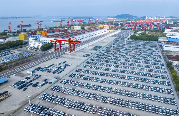 芜湖港朱家桥港区国际集装箱码头,即将出口海外的奇瑞汽车