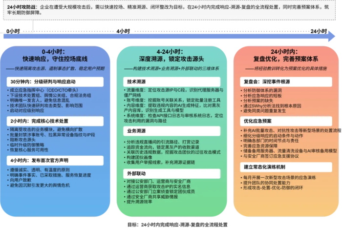 结合快手“12.22”事件的教训与行业实践,安全牛建议企业在遭受大规模攻击后,需以“快速控场、精准溯源、闭环整改”为目标,在24小时内完成“响应-溯源-复盘”的全流程处置,同时完善预案体系,筑牢长期防御屏障。