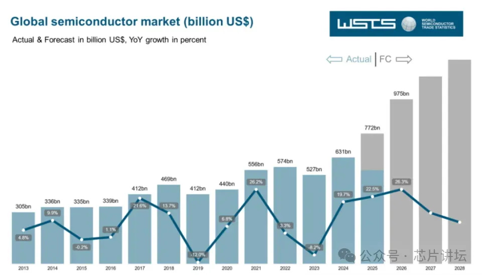 WSTS最新预测,2025年全球半导体市场规模将同比增长22.5%,2026年再增26.3%,达到惊人的9750亿美元。这已不是“复苏”,而是以万亿为目标的“跃进”。