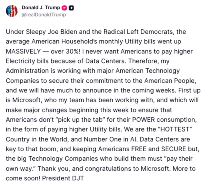 “我的政府正在与美国主要的科技公司合作,确保他们对美国人民的承诺,我们将在未来几周内宣布多项举措,”他进而宣布,微软将首先做出承诺和调整,以确保美国人民不会为更多的电力消耗而买单。