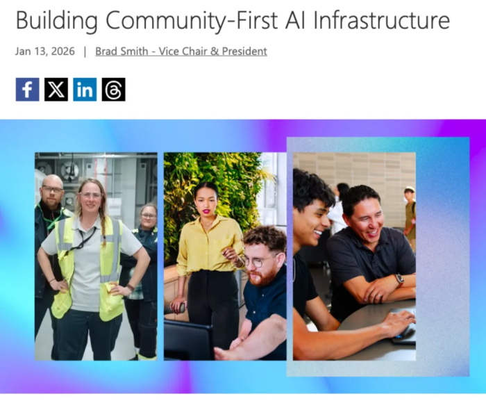 1月13日,微软总裁兼副董事长布拉德·史密斯(Brad Smith)在公司官网发布长文《构建以社区为先的人工智能基础设施》,宣布启动一项新计划,包括了五项承诺,首要的是“自掏腰包”支付电费,以保证不因此增加社区居民的账单。
