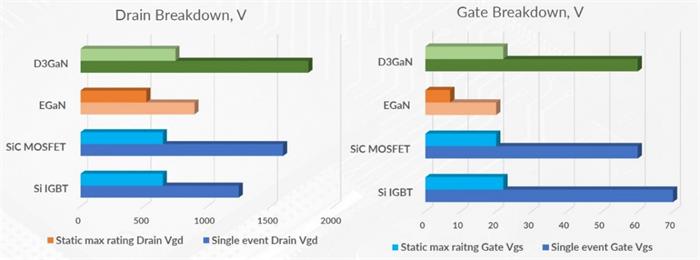 弗吉尼亚科技大学的测试数据显示,在高压环境下经过半小时百万次循环测试,D3GaN解决方案在感性负载开关中的表现可与硅及碳化硅媲美,而E型氮化镓在该场景下因栅极稳定性问题难以实现稳定性能。而在主动短路测试中(模拟汽车失效场景),硅与碳化硅器件需3倍于D3GaN的电流才能实现同等安全制动效果,这一特性让D型氮化镓在汽车安全领域具备不可替代的价值。