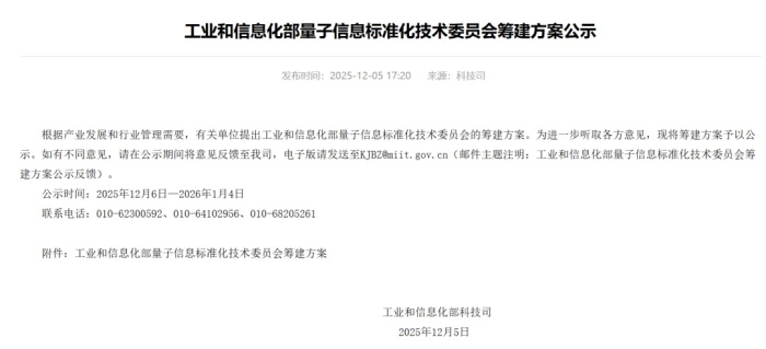 工业和信息化部量子信息标准化技术委员会筹建方案公示(图片来源:工业和信息化部官网)