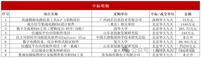 从2025年12月初至2026年1月初,短短一个月内,华大九天在全国多地密集斩获关键订单。据公开招投标及合同公告统计,其已在高校、科研院所及产业用户中成功中标或签约9个重点项目,采购方覆盖北京、上海、重庆等多个产业重镇。