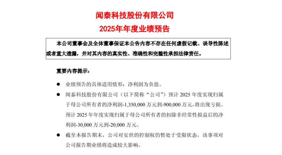 近日,闻泰科技发布了一则业绩预告,公告显示,公司预计2025年度归属于上市公司股东的净利润将出现巨额亏损,区间为人民币-90亿元至-135亿元。这一数字与2025年前三季度的盈利表现形成巨大反差,而引发业绩“急转直下”的核心原因,直指其关键子公司——全球领先的功率半导体企业安世半导体(Nexperia)的控制权持续受限。此消息一经公布,该公司于2月2日的股价开盘即告跌停。