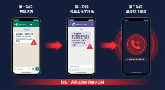 而且,攻击者早已不满足于传统钓鱼。95%的组织见证了多渠道攻击的上升——先通过WhatsApp、微信建立信任,再用Microsoft Teams、企业微信、钉钉等办公协作工具营造官方工作氛围,最后用AI伪造的CEO语音电话完成致命一击。2024年,攻击者就曾使用AI语音克隆技术冒充某公司CEO,通过协同消息传递诱骗员工泄露敏感信息甚至转账。