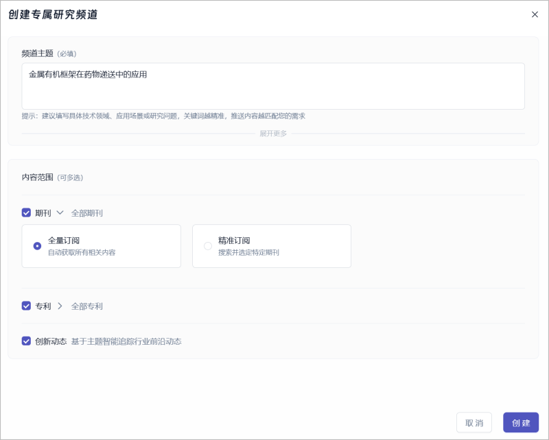 AI助手会根据你的指令,快速创建专属于你的前沿研究频道,实时为你呈现最新最相关的科研成果、技术趋势与竞争情报。