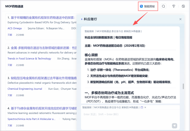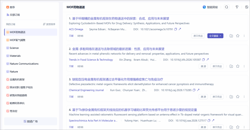 在科应「知识订阅」中,你可以像日常聊天一样,把你想关注的技术领域、应用场景或研究问题,一句话告诉这位AI助手,例如:金属有机框架在药物递送中的应用、怎样提升钙钛矿太阳能电池的稳定性……