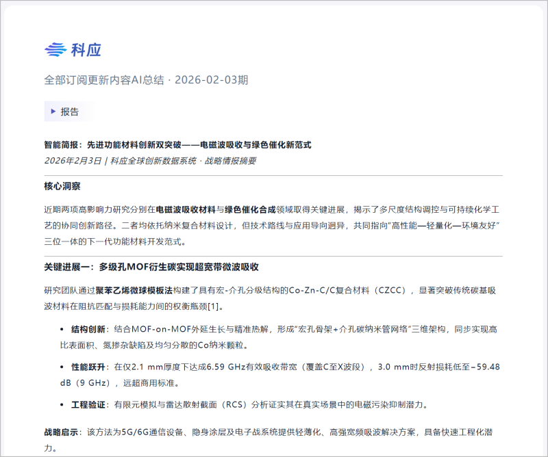聚焦研发人员开展前沿研究的需求,科应平台搭建了一座智能情报站——科应「知识订阅」智能体,它像一位不知疲倦的AI助手,7×24小时不间断追踪全球前沿动态,智能过滤低价值噪音,把与你领域相关的核心进展,以前沿简报的方式定时推送给你,让你不必再为"可能错过什么"而焦虑。