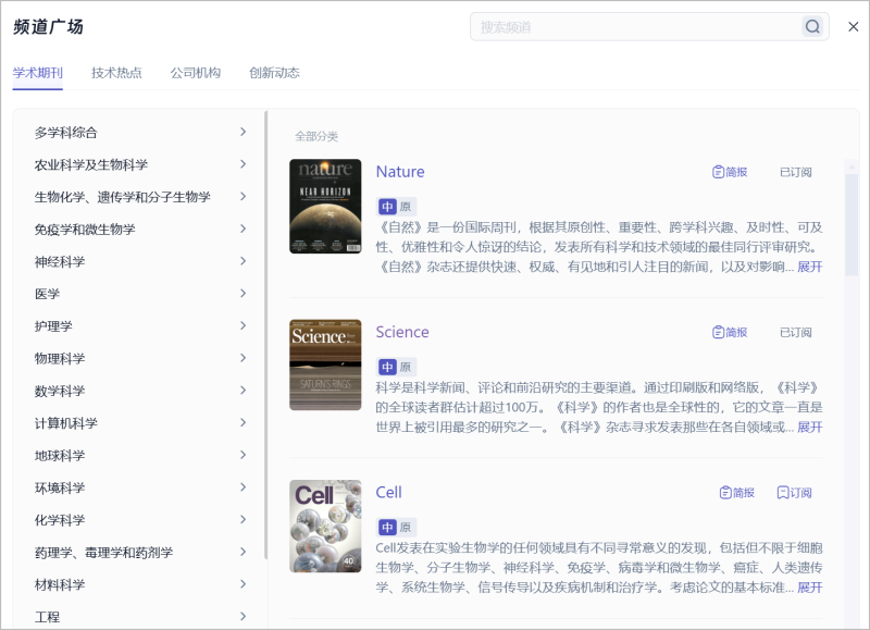 科应「知识订阅」智能体订阅范围覆盖全球——无论你想订阅学术期刊、追踪技术热点,还是想关注公司机构、监控创新动态,「知识订阅」智能体都将是你的得力助手,让全球前沿动态,尽在你的掌握。
