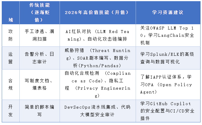 高危岗位(红灯区):安全监控(机械盯屏响应告警)、仅依赖扫描器的初级渗透测试、照搬模板的合规文档专员。