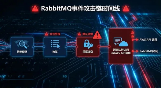 攻击链复盘:攻击者通过路径枚举发现RabbitMQ服务,利用默认凭证登录,从消息队列中窃取AWS凭证,继而在自己的macOS设备上使用这些凭证——最终触发了Wiz Defend告警。