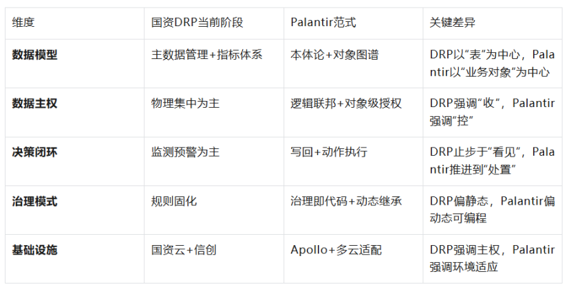 尽管目标一致——实现复杂系统的透明化与管控——但现阶段国资DRP与Palantir在实现逻辑上存在显著差异: