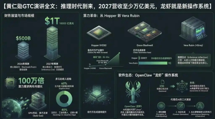 黄仁勋:推理时代到来,2027营收至少万亿美元,龙虾就是新操作系统