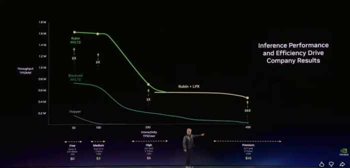 黄仁勋强调英伟达的架构能够让客户在免费层实现极高的吞吐量,同时在最高价值的推理层级上,将性能提升惊人的35倍。