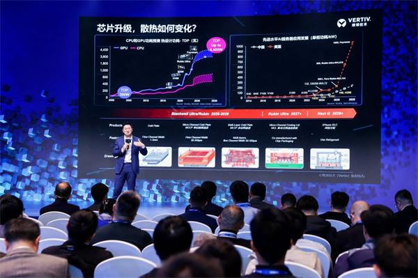 维谛技术大中华区副总裁田军博士带来冷却技术专题分享。他系统剖析GPU时代数据中心面临的五大课题:电冷首次深度耦合、技术边界不断逼近、架构需兼顾多代芯片迭代、交付周期大幅压缩至80-120天,以及故障响应时间从30分钟缩短至90秒以内。田军表示,风冷已无法满足B200/B300乃至下一代芯片的热密度,液冷、相变、多层冷板等技术亟待突破,同时SmartRun预制化电冷一体方案正加速落地。他认为,唯有生态协同才能跨越物理与资本的双重边界。
