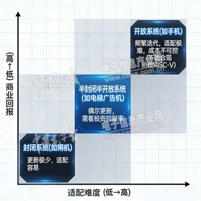 如何好用?陈景伟:在RISC-V语境下,我们探讨的生态成熟度通常指软件生态。我们可以将软件生态分成三类:封闭系统、开放系统和半封闭半开放系统。封闭系统的典型是公交地铁的闸机,搭载了嵌入式操作系统和若干软件,可能一年乃至几年都不用更新。开放系统最典型的例子是手机,用户频繁地安装、更新应用,也能够操作应用,但并不完全掌握每个应用的代码或插件,也无法干预其运行过程。半封闭半开放系统的典型是电梯里的广告机,隔三差五会更新内容或进行升级,不会几年不动,也不像手机应用那样更新频繁。封闭系统的生态适配很容易解决,因为软件名单非常有限,按照名单逐个适配就可以了。对于半封闭半开放系统,要结合投资回报率决定是否去适配。而应用频繁迭代、软件来源多样的开放计算场景,由于生态构建的复杂性和规模要求,短时间内还不适合基于RISC-V构建软件生态。究其根本,软件生态如何开发、如何迁移、如何演进优化,不是一个单纯的技术问题,更多是商业问题。相比封闭场景,开放计算场景的成本是不可控的,比如手机应用商店今天有10万个应用要适配,过一阵子就变成11万个应用。不仅适配工作量大,还需要持续的高投入,且短期内未必能盈利,这是开放系统的软件生态难以成熟的关键。那RISC-V如何进入开放场景呢?可以从全新场景和设备切入。比如我们做一款智能体耳机作为智能交互中心,采用全新的设计,从第一代就基于RISC-V架构开发软件,不涉及迁移,完全是一个新生态,那自然能够在开放场景将软件生态做起来。另外,随着AI及智能体的飞速发展,传统的软件架构受到巨大冲击,“软件迁移/适配”中的“软件”,其现有形态未来如何演化,也备受关注,最终可能导致传统的“迁移/适配”不复存在。