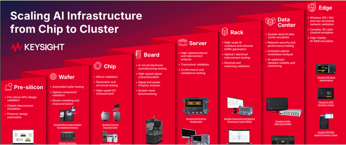 目前,是德科技已经构建了“从芯片到集群扩展AI基础设施”的全栈解决方案从底层的芯片设计验证,向上延伸至晶圆、芯片、电路板、服务器、机架,直至顶层的数据中心和边缘计算场景。这使得是德科技提供的一体化、端到端解决方案,能够帮助客户应对AI时代下从器件到系统各层级的复杂挑战,加速产品上市。
