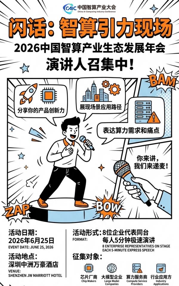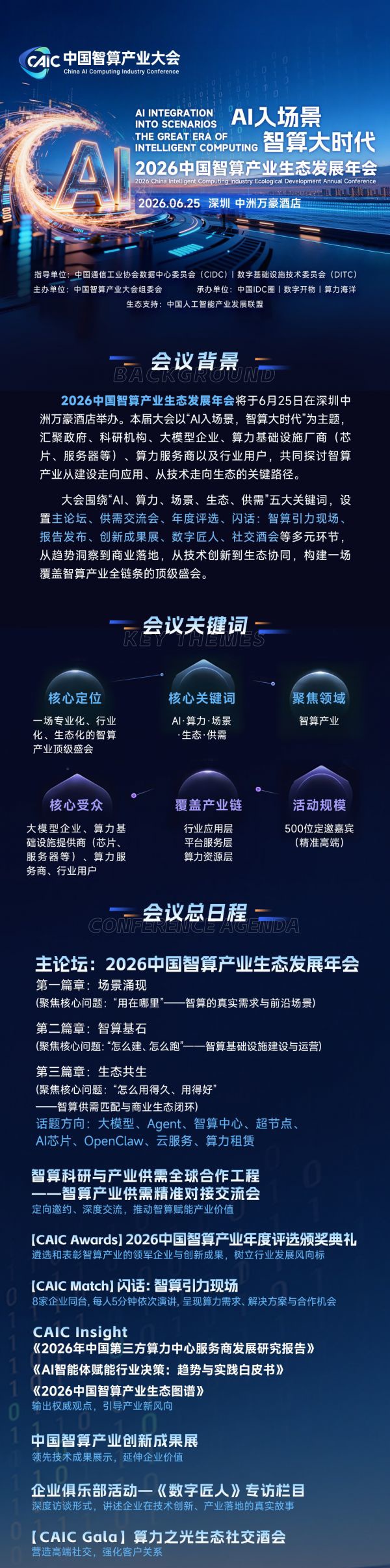 2026年,中国智算产业正站在从"算力建设"走向"算力应用"的关键节点。在此背景下,2026中国智算产业生态发展年会将于6月25日在深圳中洲万豪酒店举办。本届大会以"AI入场景,智算大时代"为主题,汇聚大模型企业、算力基础设施提供商(芯片、服务器等)、算力服务商、行业用户(政府、金融、医疗、教育、制造、汽车、能源、交通、影视、游戏等),共同探讨智算产业从建设走向应用、从技术走向生态的关键路径。