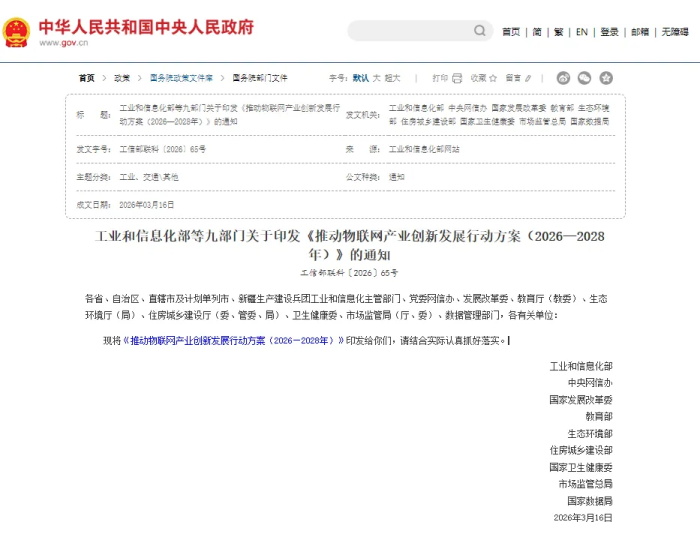 3月31日,工业和信息化部等九部门联合印发《推动物联网产业创新发展行动方案(2026—2028年)》(以下简称《行动方案》)。物联网与人工智能双向赋能、融合发展,正成为培育发展新质生产力的重要战略抓手。方案给出了一组极具雄心的量化目标:到2028年,培育打造10个亿级连接和15个千万级连接的应用领域,物联网终端连接数力争达到百亿级规模,物联网核心产业规模突破3.5万亿元。