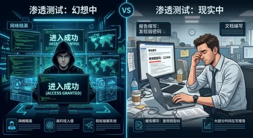 在大众想象中,渗透测试从业者如同影视剧中的顶尖黑客,只需轻敲代码,便可突破高科技企业的服务器防线,实现对目标系统的全面掌控。然而现实却是,不少新手渗透测试人员耗费数日时间,在文档中反复阐释“123456”这类弱口令为何无法为系统提供有效安全防护。这一极具反差的场景,精准戳破了行业宣传营造的虚幻泡沫,还原了渗透测试岗位最真实的日常。