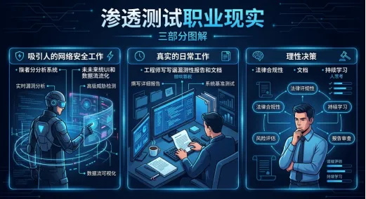 渗透测试的魅力在于对系统安全的深度挑战,但其日常工作更多是耐心坚守、文档编撰与持续技术迭代。这份行业忠告清晰点明,切勿被“酷炫黑客”的影视化形象蒙蔽,需理性审视自身是否能够接受长期的文档工作、严谨的法律合规流程与永不停歇的技术升级。