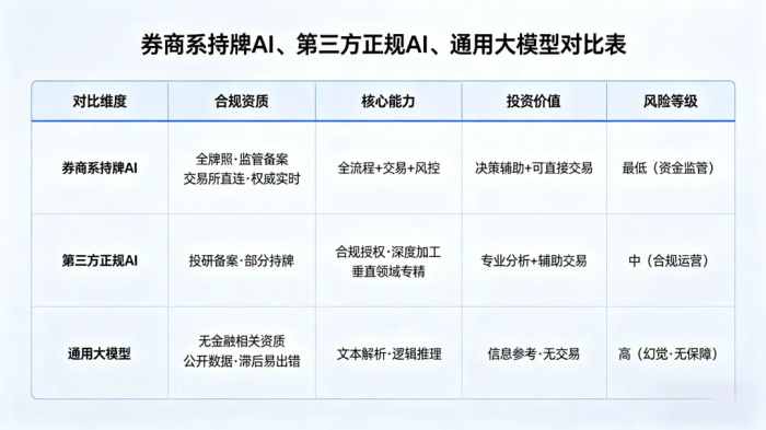 作为持牌金融机构,券商是AI金融应用的主力军,依托交易所直连数据、监管备案算法、银行资金存管等核心优势,成为AI技术与金融业务融合最规范的载体,也是普通投资者的首选。