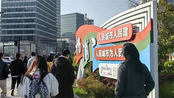 走出展厅,同学们步入园区开放空间,实地远眺了哔哩哔哩、叠纸科技等多家创新企业的办公大楼。这些建筑各具特色,与周边高校、社区有机融合,生动诠释了产城融合、校企共生的创新生态格局。