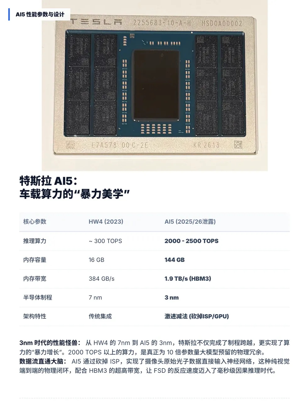 省下来的晶体管预算,全砸给推理单元。这就是特斯拉做减法的逻辑,只做自己需要的事,然后做到极致。