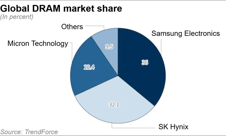 三星、SK海力士和美光三家公司合计占据了全球DRAM市场约90%的份额。它们基本上是仅有的几家能够生产HBM芯片的公司。